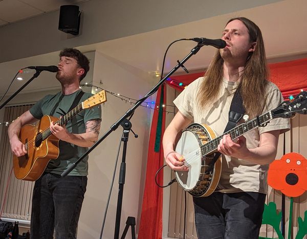 For the final concert of the day we welcomed Sam Kelly and Jamie Francis who had previously performed at the Poppy as part of the Sam Kelly Trio. We had a song from the floor by Ally and Jez, then it was into the main event. Sam is an excellent singer and guitarist and was accompanied by Jamie on banjo and acoustic guitar. They first started playing together at University and treated us to two fabulous sets of folk songs and self written material interspersed with tunes written by Jamie. Too many highlights to list them all, but songs in the first half included 'If I were a Blackbird', 'Angeline the Baker' and 'Eyes of Men', the first song that they wrote together. After a short break to refill glasses we started the second half with a song from the floor from Dan Kittmer- Stan Rogers' 'The Mary Ellen Carter'- then Sam and Jamie gave us another splendid set. This included the well-known 'The Golden Vanity', a brand new song by Sam and Jamie 'Till Sleep Comes Calling', and a cover of Dire Straits 'Sultans of Swing' without which apparently they would not have got their breakfast the next morning! All good things come to an end and the guys left us with 'My Lagan Love' and 'Greenland Whale'. An excellent way to finish the day, except…