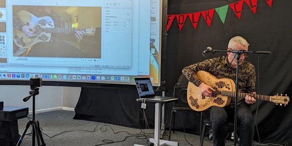 After a quick break to re-arrange the chairs, it was on to the second event of the day. Part talk part performance, Steve played the Carolan guitar he helped to devise- an acoustic instrument that tells its own story. With tunes, visuals and the use of Artificial Intelligence, notably on 'The Butterfly' featuring virtual flute as accompaniment, this was a fascinating hour spent exploring the traditional and the modern.